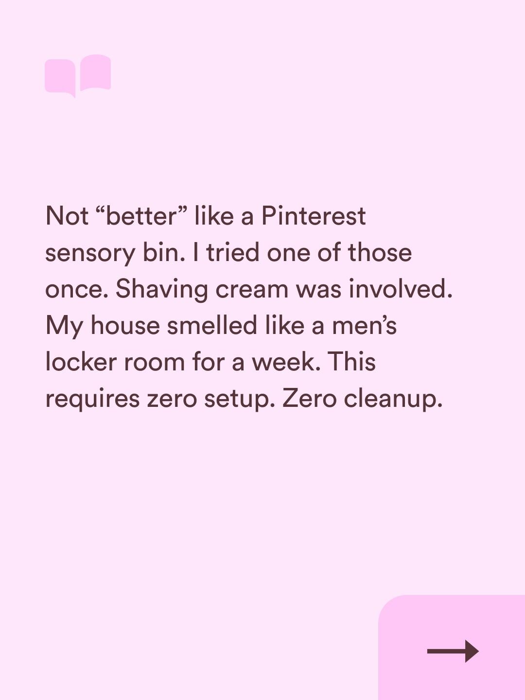 I tried a sensory bin with shaving cream once. My living room smelled like a men's locker room for a week. I respect every mom who has the bandwidth for elaborate setups. I do not always have that bandwidth. Playing with a toddler is tiring.