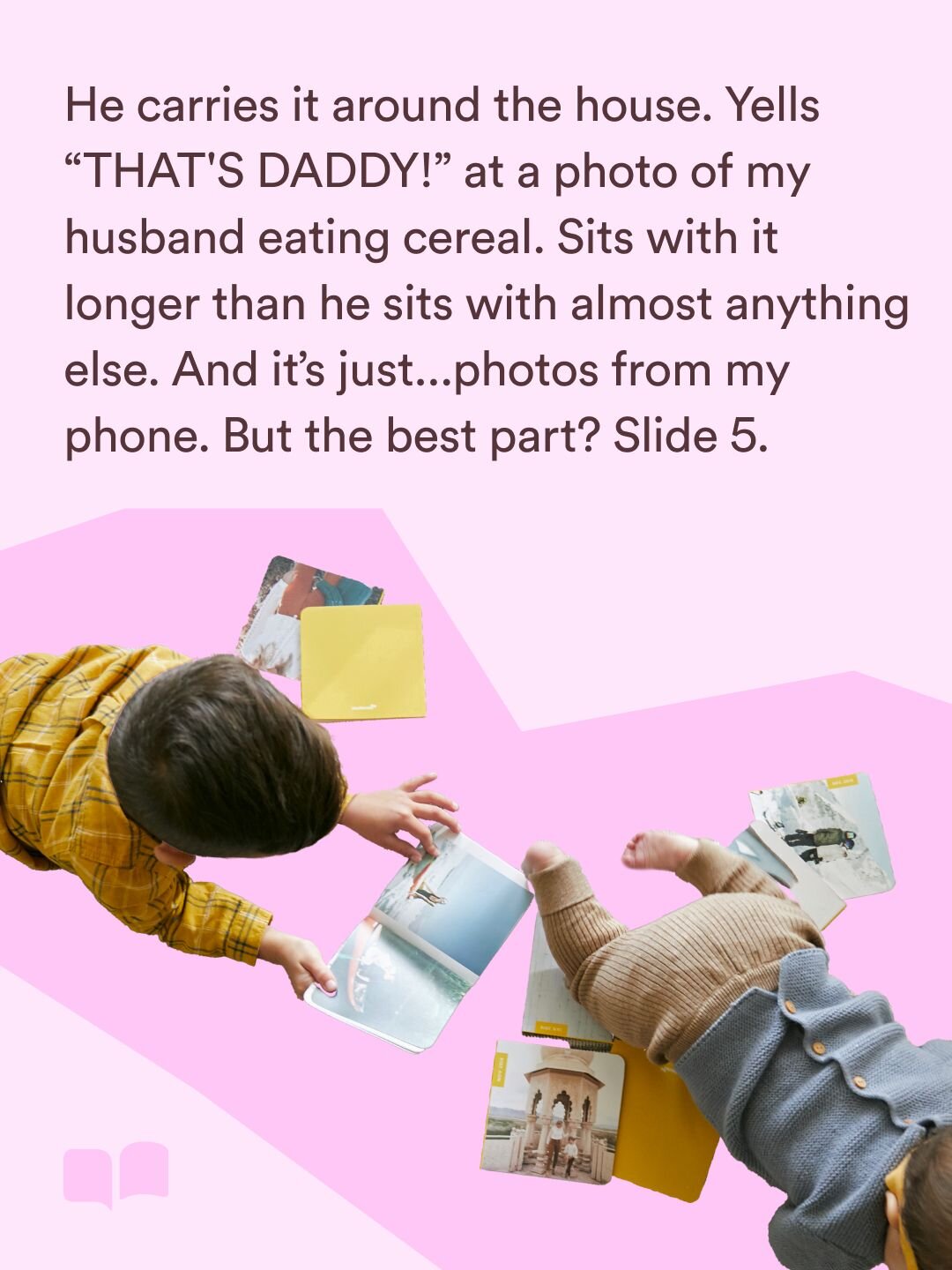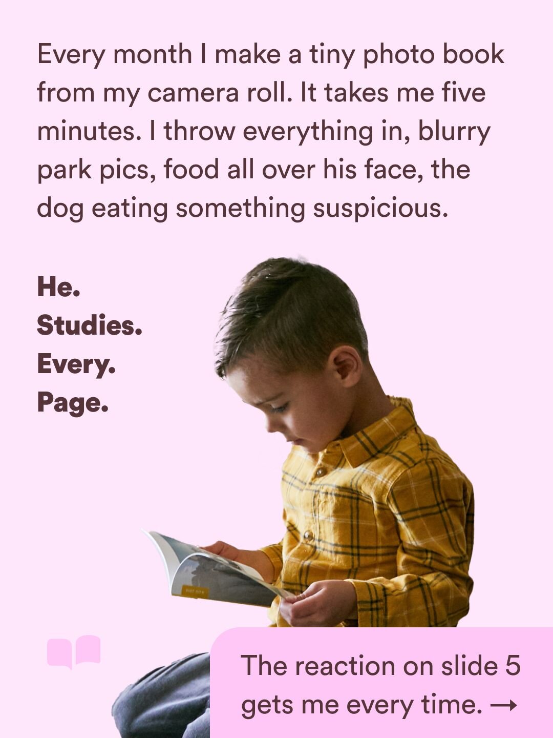 Every month I make a little photo book from my camera roll. Takes me maybe five minutes. I'm not precious about what goes in because my toddler loves it all, the random accidental picture at the park, him with food all over his face, the one where the dog is eating something suspicious in the background. He doesn't care. He studies every single page.